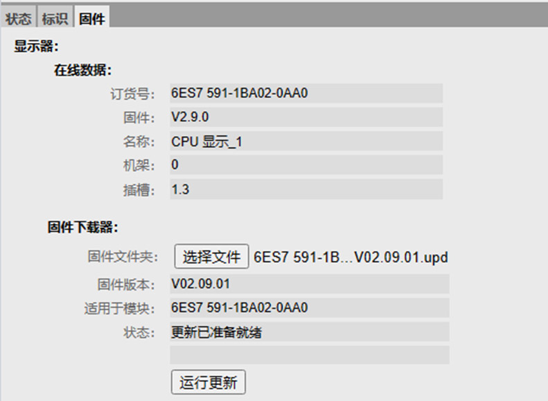 存儲(chǔ)卡的大小要超過固件文件大小,才可使用存儲(chǔ)卡進(jìn)行固件更新。如:V2.9.2之后,所有S7-1500系列CPU如果通過存儲(chǔ)卡更新,都至少需要256 MB存儲(chǔ)卡;1500顯示屏的固件文件較小,使用至少12 MB的存儲(chǔ)卡即可。