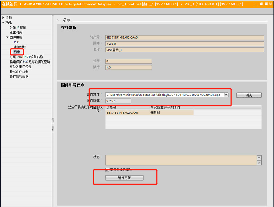借助TIA Portal軟件,也可在“在線訪問”中進(jìn)行固件更新,步驟如下:1. 連接PLC后,在博途項(xiàng)目樹中展開“在線訪問”,搜索到需要更新的設(shè)備,進(jìn)入“在線和診斷”顯示下選擇對(duì)應(yīng)文件并運(yùn)行,即是對(duì)CPU顯示屏更新固件: