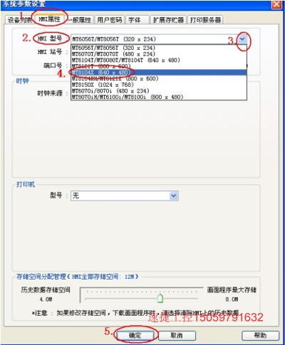 3、選擇“HMI 屬性”項(xiàng),在 HMI 型號(hào)中,點(diǎn)下拉箭頭選擇 MT8104X 相對(duì)應(yīng)的選項(xiàng)。